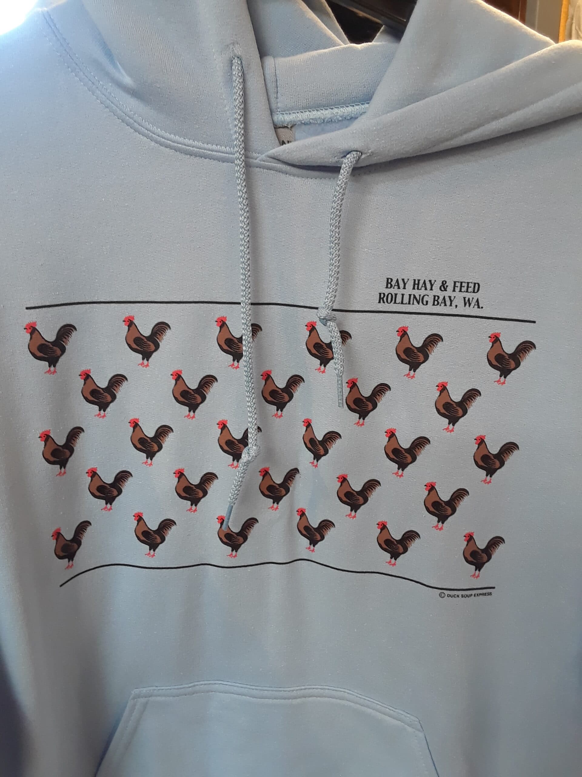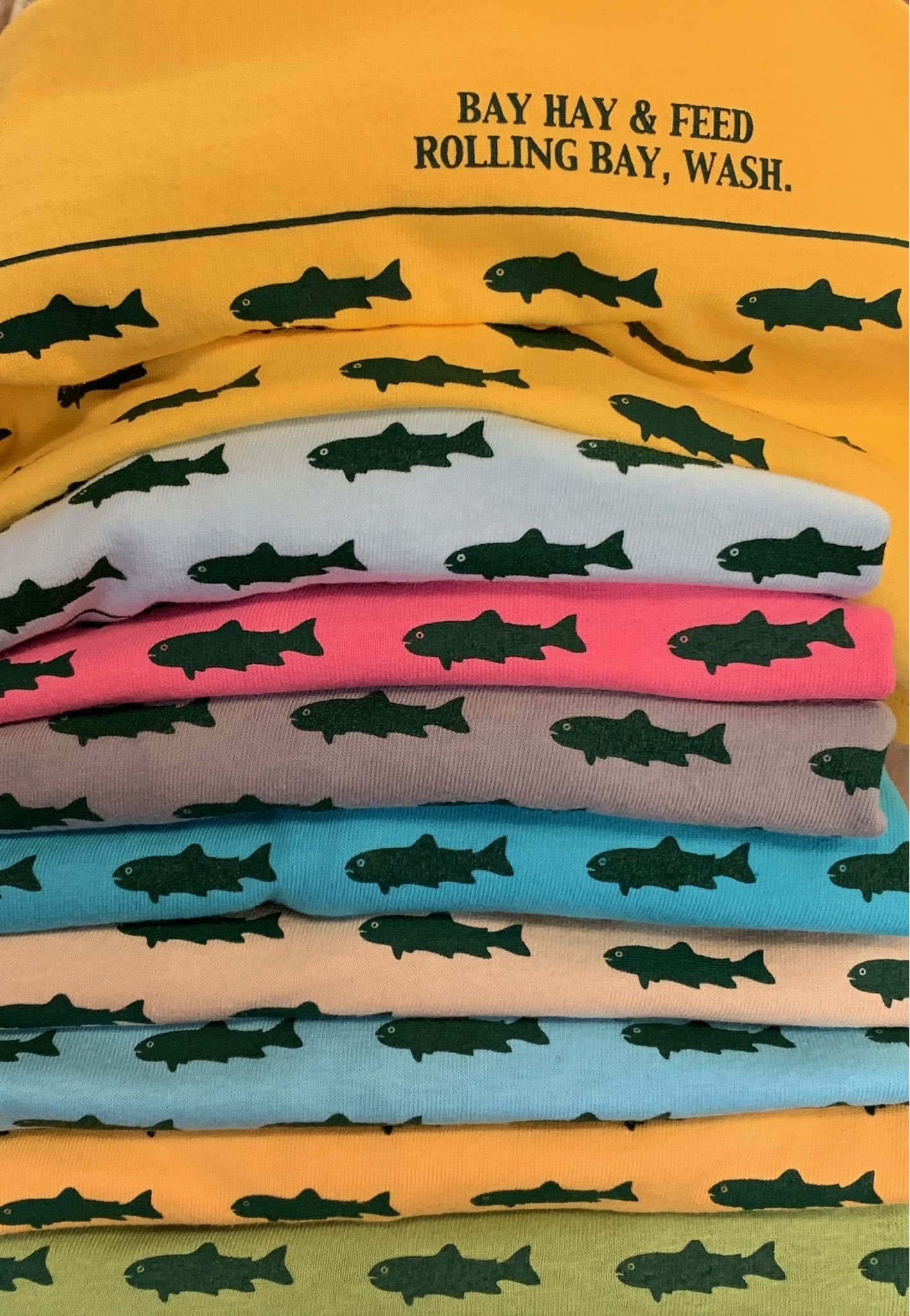 T-shirts, crew sweatshirts, hoodies, tank tops and kids wear come in rows and rows of farm animals in color combos that we can’t keep track of. Yes, the Bay Hay shirt definitely has a life of its own! It cloned and morphed, and before we knew it, thirty years later, we realized more than 750,000 shirts have left Rolling Bay, and popped up around the world. Customers send pictures back to us of themselves wearing them in the funniest places. If you’d like to model yours for posterity (some combinations have never been reproduced), please send us a photo or post it on instagram and tag us.