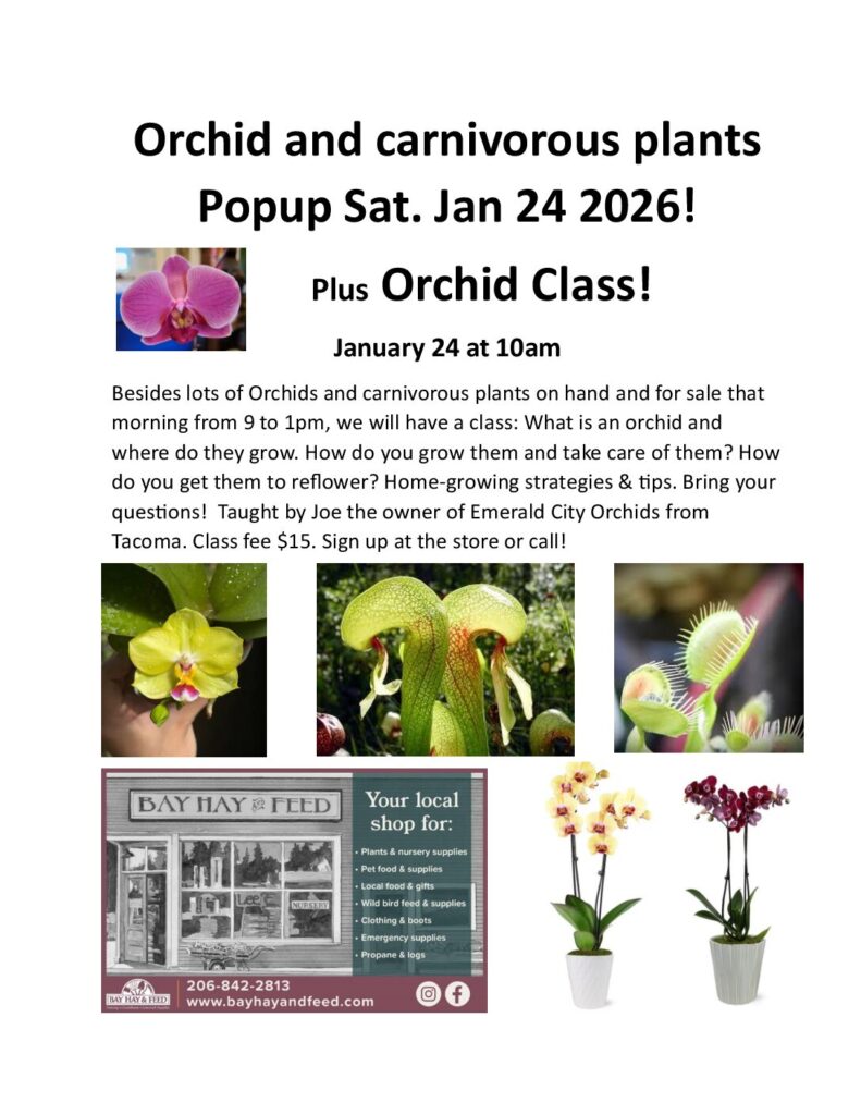 Besides the Orchid pop up we will have a class: What is an orchid and where do they grow. How do you grow them and take care of them? How do you get them to reflower? Home-growing strategies & tips. Bring your questions! There will be one classes and lots and lots of Orchids will be for sale. Taught by Joe the owner of Emerald City Orchids from Tacoma